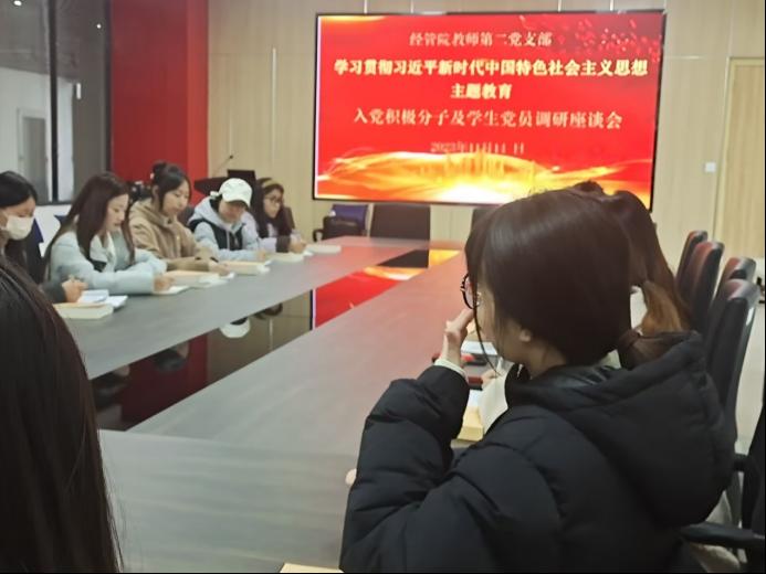 为深入学习贯彻习近平新时代中国特色社会主义思想,更好地开展教学教育工作,公司党总支教师第二党支部于2023年11月14日下午14:00在财经楼205召开第42期入党积极分子及员工党员调研座谈会。本次会议由公司党总支教师第二党支部书记李依璘主持,部分第42期入党积极分子员工参加了此次会议。