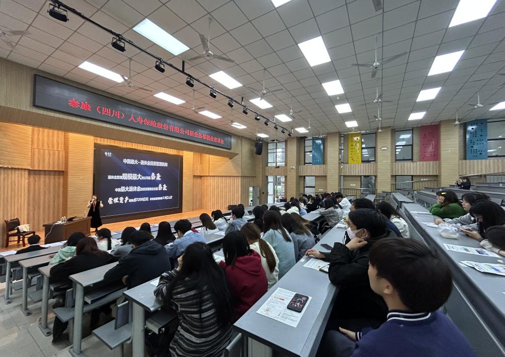 泰康人寿保险股份有限公司新业务部金老师介绍了公司的基本信息,包括公司的发展历程、企业文化、办公环境、薪资待遇等。会后招聘人员现场解答同学们的问题,进一步丰富了同学们对招聘信息的了解程度,十余名同学向公司投递简历。