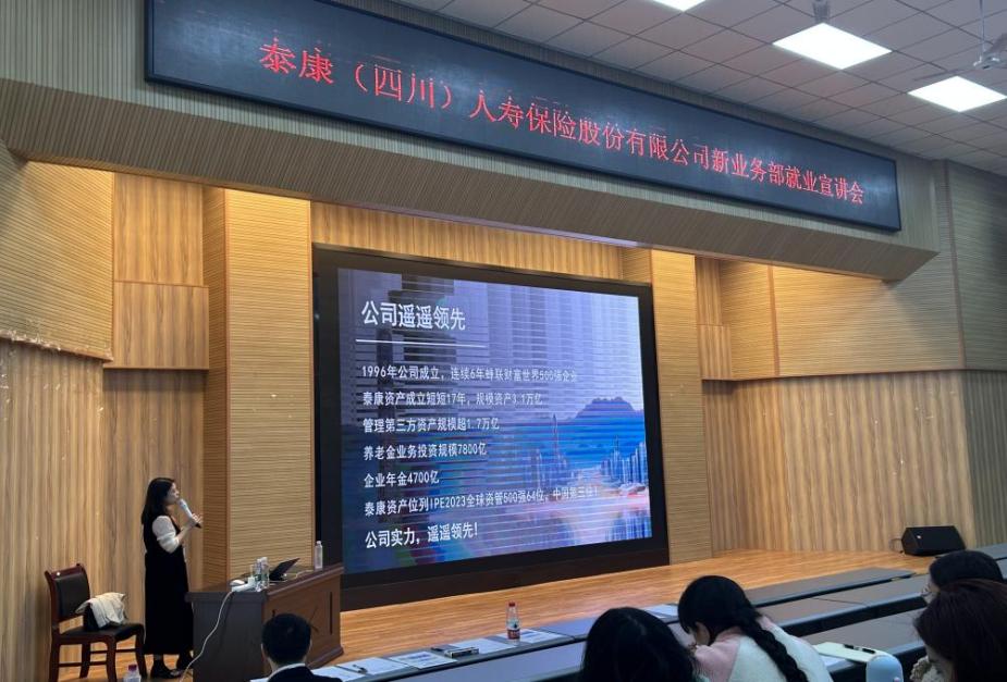 为进一步加强公司与用人单位之间的沟通与联系,拓宽公司学子就业渠道、增加就业机会,泰康人寿保险股份有限公司于2023年10月30日下午15:30在1B多功能厅举办专场招聘宣讲会。大三工商管理和中小企业百余名员工参与此次招聘宣讲会。