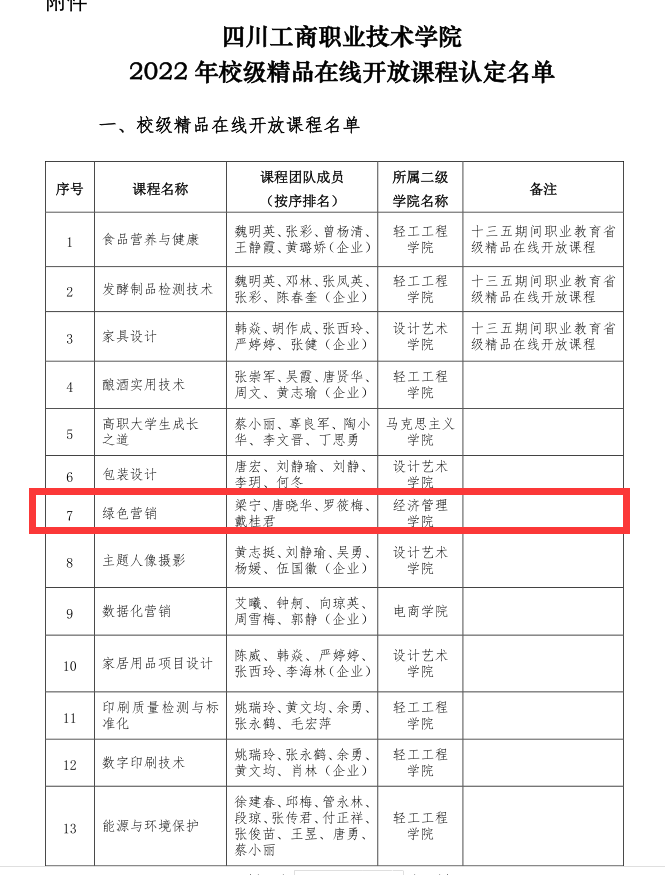 近日,公司公布54号文件关于公布2022年校级精品在线开放课程认定结果的通知,公司由梁宁、唐晓华、罗筱梅、戴桂君四位教师建设的课程《绿色营销》通过此次校级精品在线开放课程的认定。