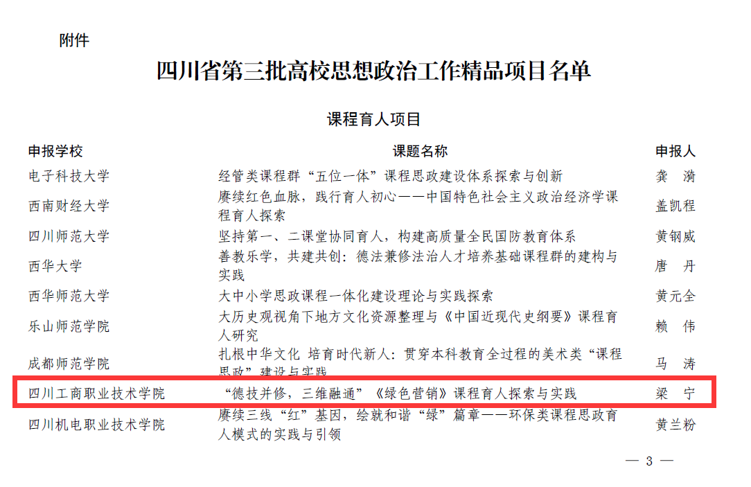 近期省教育厅先后公布了第三批“三全育人”综合改革试点高校和第三批高校思想政治工作精品项目名单。公司跻身四川省“三全育人”综合改革试点高校行列,公司梁宁团队的课程育人项目“‘德技并修,三维融通’《绿色营销》课程育人探索与实践”获评四川省高校思想政治工作精品项目。
