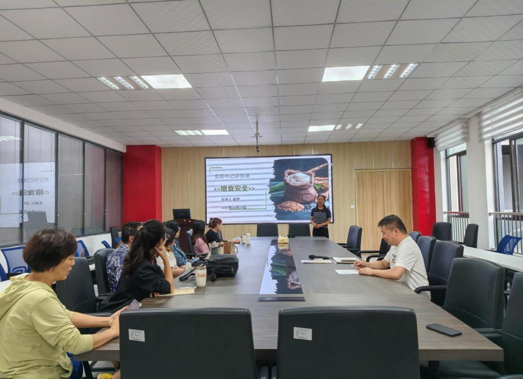 首先,党支部书记梁宁带领全体党员一起学习贯彻习近平总书记关于国家粮食安全的重要论述精神,重点解读了《论 “三农”工作》中“藏粮于地、藏粮于技”的核心要义,并强调粮食安全不仅是国家安全的重要基石,更是立德树人的鲜活教材,大学教师群体肩负着将粮安理念植入青年老员工心中的特殊使命。其次,开展警示教育,结合教育系统实践案例、全球粮食市场的不稳定因素等,警示大家要筑牢粮食安全防线,把粮食安全教育融入育人全过程,始终保持“启智润心、久久为功”的责任感。最后,积极倡导党员教师要带头践行“光盘行动”,在校园食堂管理、家校共育中发挥先锋作用。并指出,要以此次党课为契机,把粮食安全教育作为思政育人的重要抓手,完善“理论 + 实践 + 科技”的教育模式,让每一位教师都成为粮安理念的传播者,每一间课堂都成为守护大国粮仓的育人阵地。