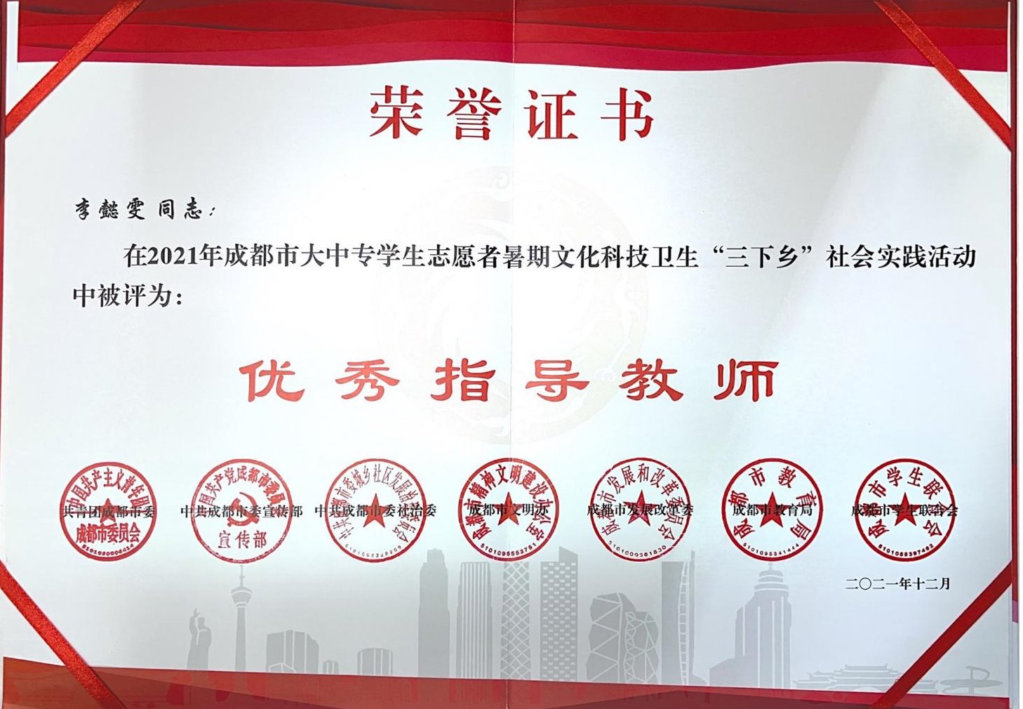 近日,共青团成都市委办公室对2021年成都市大中专员工志愿者暑期文化科技卫生“三下乡”社会实践活动进行表彰,并颁发了证书和奖牌。公司永利yl23411集团团总支荣获优秀组织奖,永利yl23411集团赴三坝村宣讲团队荣获“优秀实践团队”荣誉,李懿雯老师荣获“优秀指导教师”称号。