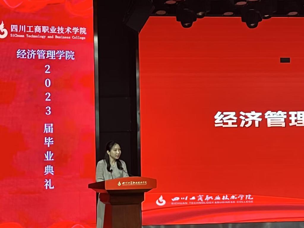 典礼第五项,毕业生代表张睿琪同学发言,她用自身行动告诉我们,在公司积累的专业知识是可以在社会中转变为精神财富或物质财富,前方的道路虽然崎岖,但要一直保持自信,相信我们可以在顶峰相见!