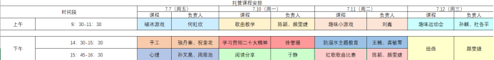 在与三坝社区书记沟通后,我们了解到三坝社区小朋友们较多且农忙时期有照看小朋友们的需求,于是决定开展“托管班”。考虑到暑期“托管班”与公司日常教育不同,在给小朋友们提供基本看护服务的同时,应积极尝试开展丰富多彩的活动。按照孩子们的年纪,我们制定了如下课程: