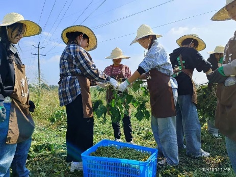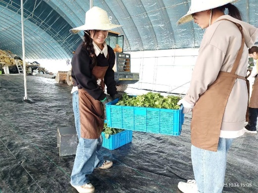 活动伊始,老师带着大家逛蔬菜基地,逛完之后被分为两批,男生负责搬运铁货架、木架,女生负责摘毛豆、摘茄子。在这过程中,同学们也感受到了劳动的辛苦与快乐,体会到了“锄禾日当午,汗滴禾下土”的辛劳,懂得了一粥一饭来之不易。也许这是大家第一次做志愿活动,但完成任务时,成就感在此刻油然而生。下午大家做完分配的工作之后与老师在百姓农场合影留念。