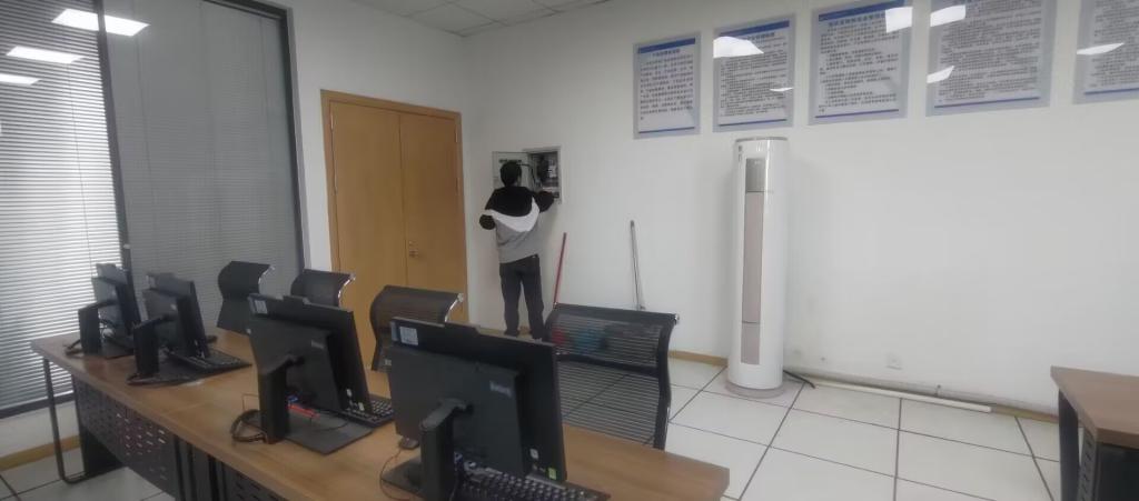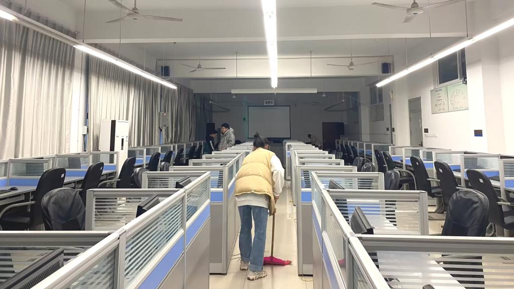 实训部助理与来自工商22345的5名同学对公司的公共实验实训地进行了安全检查和大扫除。按照5S管理标准对桌面、显示器、主机等表面浮灰进行清洁,对机房静电地板进行清扫,对桌椅夹缝、门窗户沿边等卫生死角进行了深度清理。本次活动不仅美化了实验实训教学环境,更展现了实训部与各班级同学们的责任意识与奉献精神。
