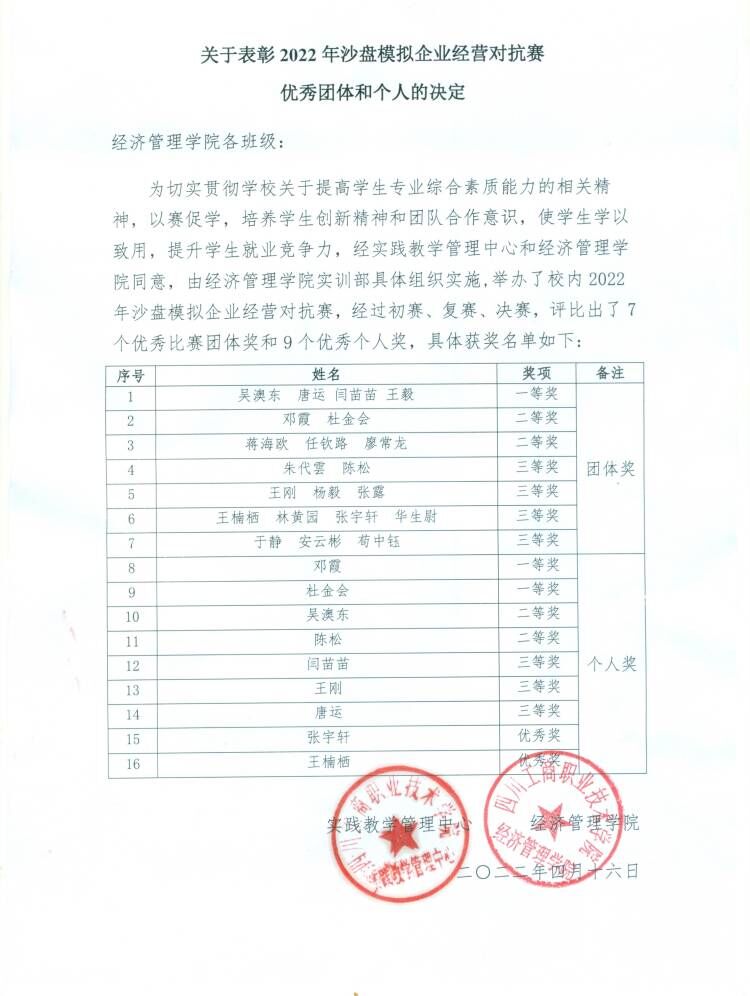 关于表彰2022年沙盘模拟企业经营对抗赛优秀团体和个人的决定