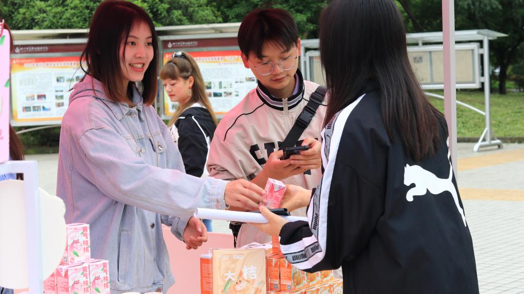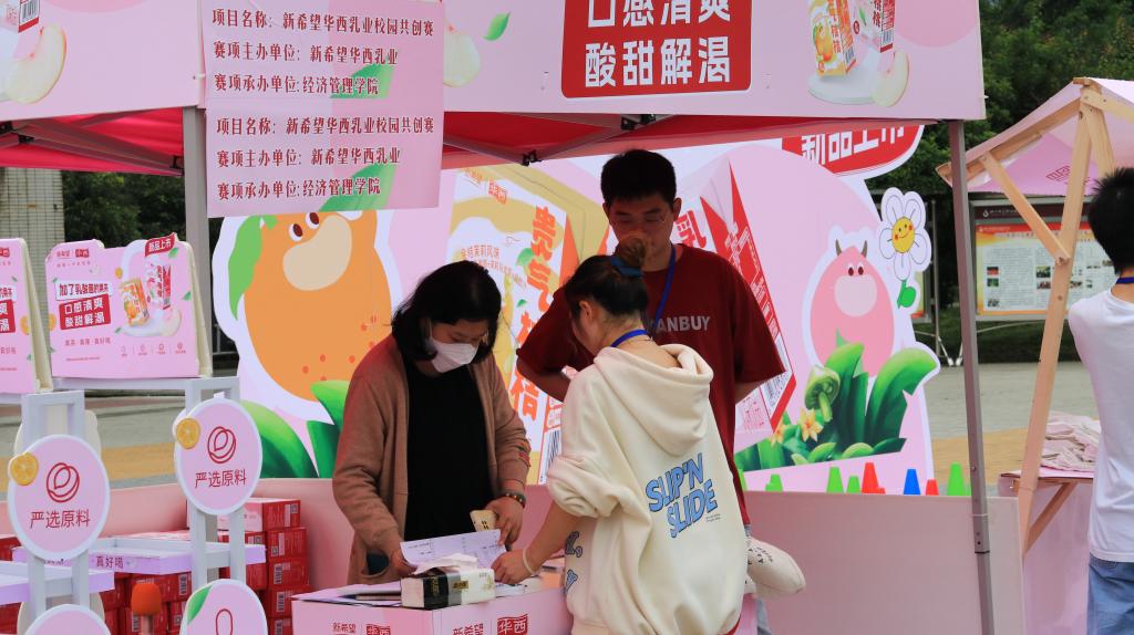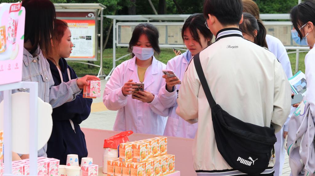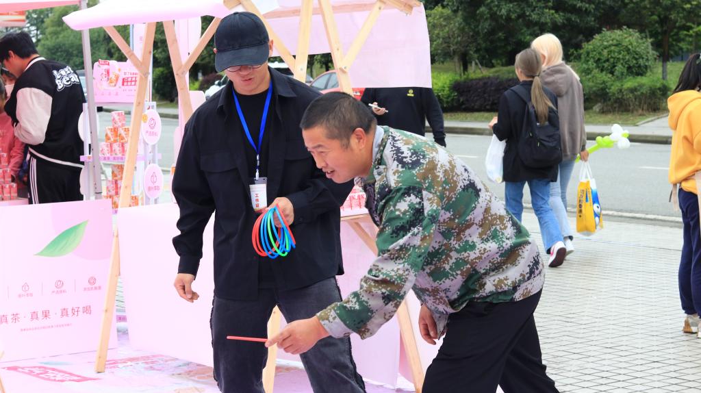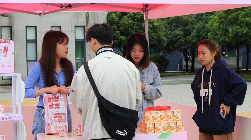 比赛共设有四个固定摊位和10个流动摊位。在销售现场,各色的吆喝声不绝于耳。每个摊位的产品整齐摆放在前,摊位周围聚集了大量询问的师生。为了更好地推销产品,同学们使出了浑身解数,通过促销优惠、随机抽奖、免费试喝等方式加大促销力度。在这些小活动的助力下,不少师生选购了自己喜爱的产品。在活动现场,还安排了社团节目表演、套圈小游戏等活动,烘托比赛热闹氛围,吸引了更多员工参与活动。